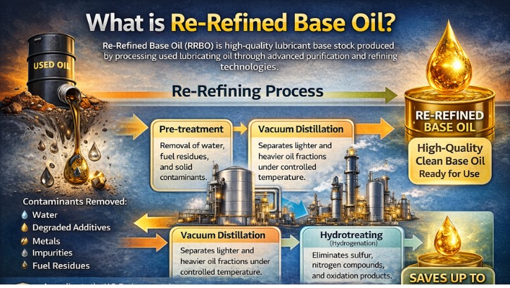Re-Refined Base Oil (RRBO) is a high-quality lubricant base stock produced by processing used lubricating oil through advanced purification and refining technologies. Instead of discarding used oil as waste, re-refining removes contaminants, degraded additives, metals, and impurities to restore the oil back to a usable base oil form. According to the U.S. Environmental Protection Agency (EPA), re-refining used oil can save up to 85% of the energy required to produce virgin base oil from crude while significantly reducing environmental waste.