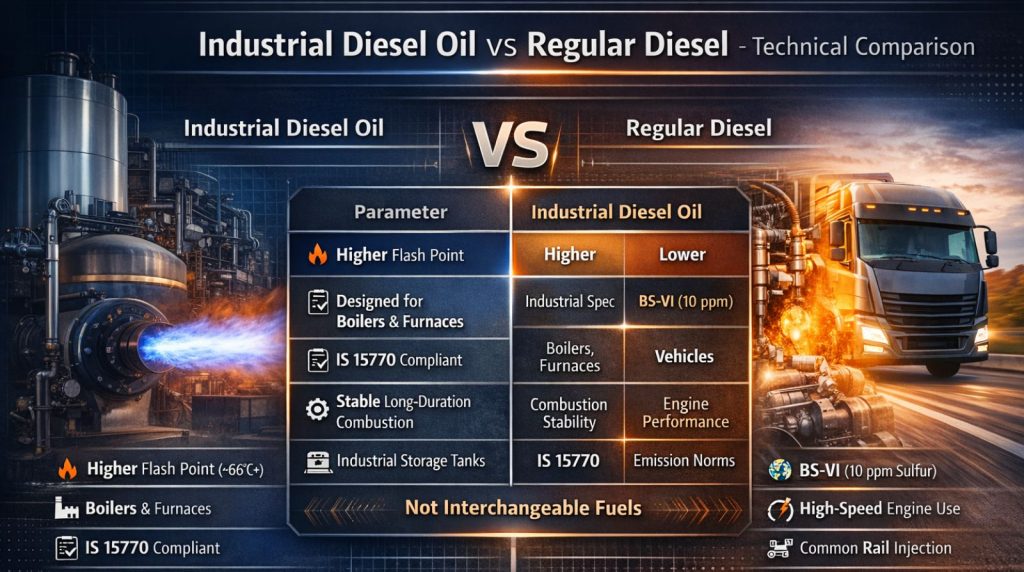 Many procurement teams assume diesel is “diesel,” without checking regulatory standards. Automotive diesel is regulated under emission norms governed by the Central Pollution Control Board, while Industrial Diesel Oil follows industrial specifications such as IS 15770.