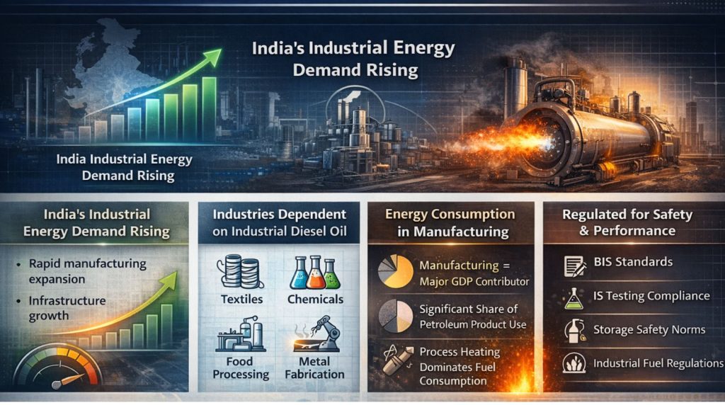 India is one of the fastest-growing energy markets globally. According to the International Energy Agency, India’s industrial energy demand is expected to increase substantially over the next decade due to infrastructure development and manufacturing expansion. Liquid fuels, including industrial-grade diesel, remain critical in sectors where electrification is not yet fully viable.